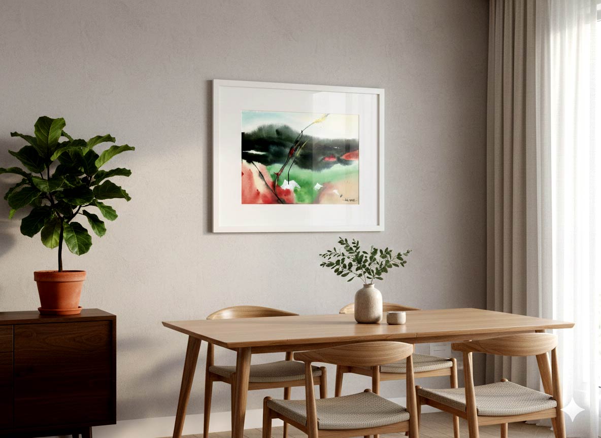 A soulful exploration of memory and the passage of time, Remembrance Original Painting utilizes the fluid, unpredictable nature of watercolor to capture a fleeting moment. Soft washes of sage green and earthy terracotta ground the piece, while a bold, dark horizon line anchors the composition. The delicate, upward-reaching linework suggests growth and longing, emerging from the soft-focus landscape like a distant thought coming into clarity. This original artwork by Anil Nene is an invitation to pause and reflect. Original size 12" X 9"