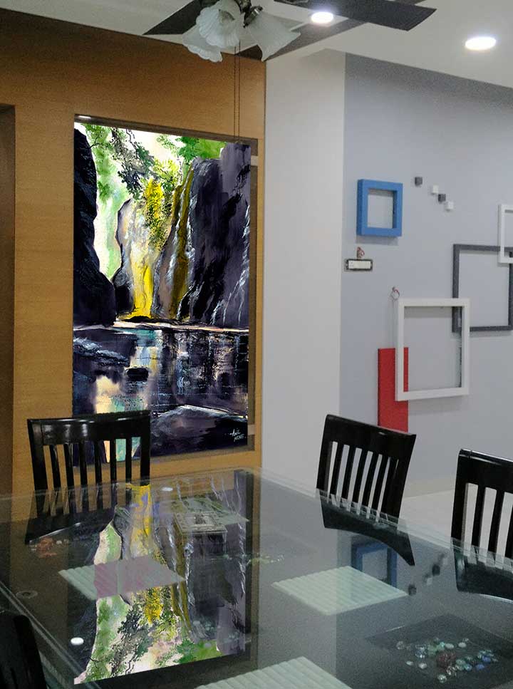 This original handmade watercolor painting will captivate viewers with its stunning play of light and dark shadows, enhanced by the addition of water. The contrasting elements of the solid rock scene and the fluidity of water create a sense of mystery that draws in the viewer. With a size of 14" x 21" and the ability to be shipped worldwide, this piece is an ideal addition to any art collection.