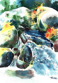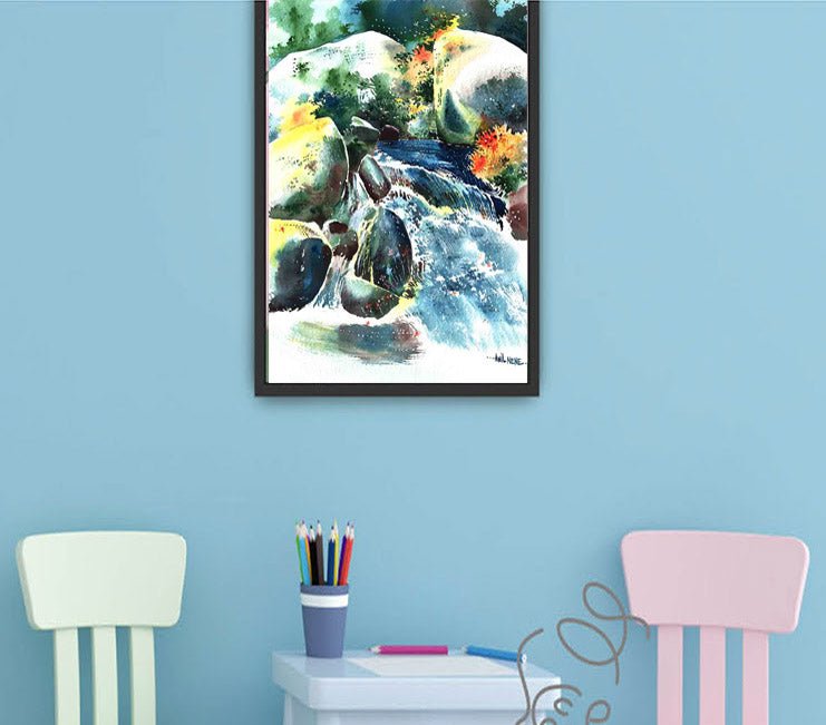 This mountain stream painting will be good for your living dining bed rooms. This painting is multi color matching any wall color or decor. Liveliness of this artwork will cheer you every morning. Flowing water in this painting is one of the 5 natural elements. Original Handmade Watercolor Painting size is 11" X 16" - Unframed. After framing this painting will be 17" X 22". This painting can be rolled and shipped all over the world.