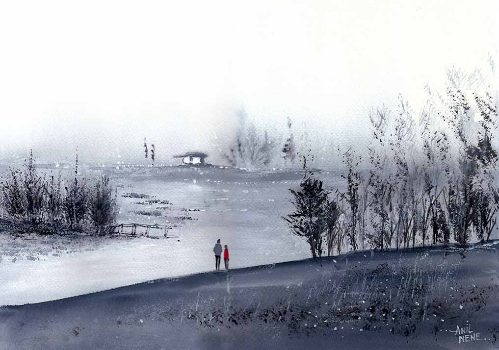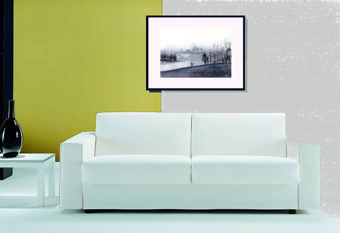 This Misty painting is inspired by early morning walks in nature. This grey monochrome painting will suit or match any wall color or decor. Red color t-shirt is the surprise element if you go into the details of this artwork. The original unframed size of this painting is 15" X 11"