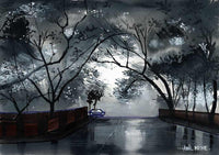This original Rainy Day painting by NeneArts is the perfect addition to your home or office. Its monochromatic design, measuring 13.5" X 9.5", makes it a versatile piece that will match any color or decor. Bring a cool and refreshing mood into your space with this stunning artwork.