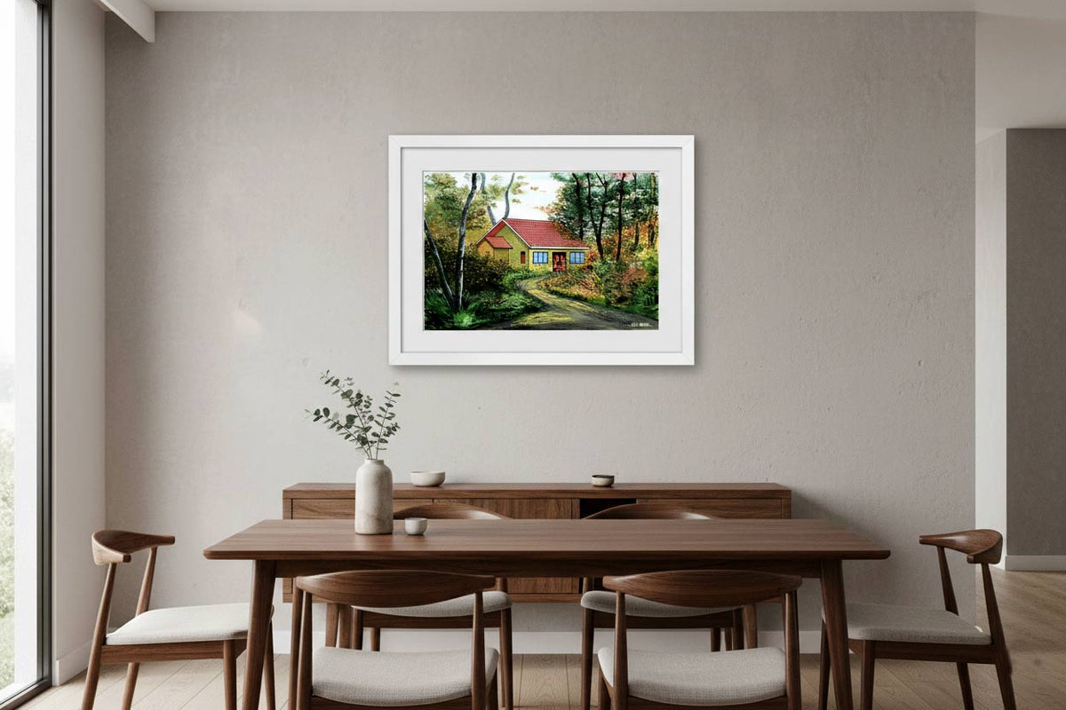 A serene escape nestled within a sun-dappled forest. This original painting, 'Sweet Home,' captures the quiet magic of a woodland cottage at the golden hour. With its vibrant red roof and glowing yellow walls, the house stands as a beacon of warmth against the lush, textured greens of the surrounding wilderness. The winding path invites the viewer to step into a world of peace, where the only sound is the rustle of leaves and the soft light of evening. Original Painting Size 21" X 14"