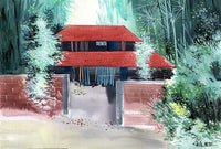This vibrant red house contrasts strikingly with its lush green environment, evoking a sense of mystery. Surrounded by abundant greenery, it appears gently embraced by nature’s embrace. The scene captures the captivating and enigmatic qualities of the natural world. The original artwork measures 21" by 14".