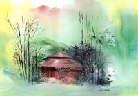 This stunning painting of a sweet home invites you to relax and immerse yourself in nature. The lush green surroundings will create a peaceful ambiance, providing a sense of well-being whenever you glance at it. Original unframed size 21" X 14".